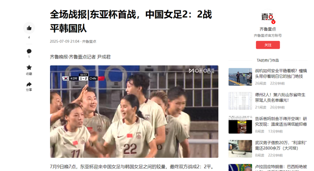 全场战报|东亚杯首战,中国女足2:2战平韩国队 2025-07-09 21:04·齐鲁壹点